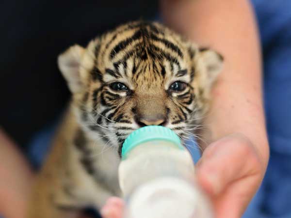 The cub’s birth was a surprise to zookeepers, who didn’t know that mama tiger was pregnant. Both of her parents, mother 9-year-old Jaya and father 4-year-old Malosi, live in the zoo’s Asian Forest Sanctuary, but the cub will be hand-reared, as the mother showed little interest in her offspring (apparently that’s not unusual). The cub is strong and healthy. She’ll be getting her name today.
