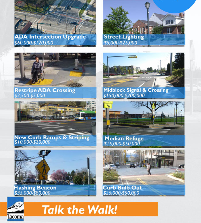 The improvements will be focused specifically on crossing improvements - markings, beacons, ADA upgrades, curbs, ramps, striping, bulb-outs, crossing islands, etc. Projects that don't make the cut in this round may get added to Tacoma's Transportation Master Plan for future consideration.