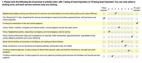 Citizens’ Rating of City Services (pdf) (assign dollar values to categories of city services, and rate more specific service funding as to be eliminated, decreased, maintained, or increased)