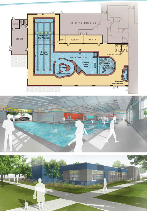 The project includes ... a new indoor pool building, including a leisure pool in the existing natatorium footprint and an additional lap pool and associated pool support spaces west of the existing building.
