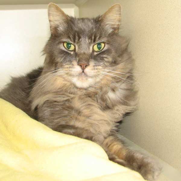 Elliot is a regal looking tabby in search of an indoors only forever home. This 7 year old neutered male is declawed and can be a bit shy when first meeting people. Give Elliot a little time and he comes out of his shell and shows his true personality– a love bug who head butts legs for attention and desires never-ending chin scratches. Elliot would do well in most any home, but would love to find a quiet place with people who have lots of time each day to spend with him.