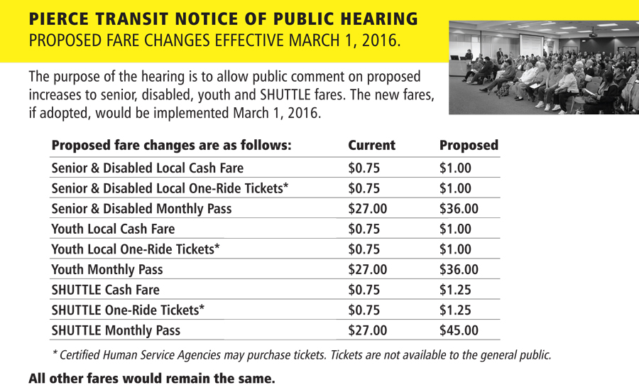 Pierce Transit is proposing fare increases for senior, disabled, youth, & SHUTTLE passengers.