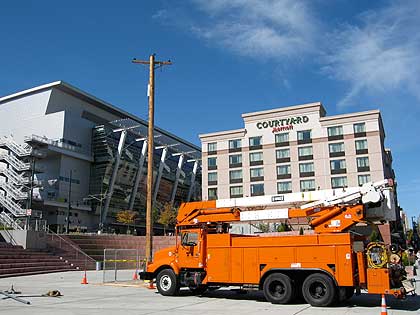 It’s being installed as part of the Governor’s Industrial Safety and Health Conference at the Greater Tacoma Convention Center on Wednesday and Thursday. On Wednesday, September 26th, at 1:00 pm there will be a pole top rescue competition in Tollefson Plaza. Twelve teams of linemen will begin competition tomorrow at the Tacoma Power facility at 74th and Tyler. The next day, four teams will be in Tollefson Plaza. From what we hear, the competition will be intense and, if you’re in the area, shouldn’t be missed.