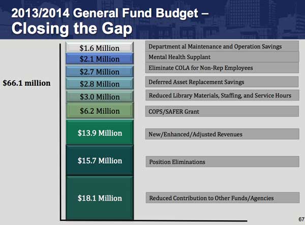 There will be other cuts, more or less across the board, as well as some departmental reorganization to make up the budget gap of more than $60 million in the next two years.