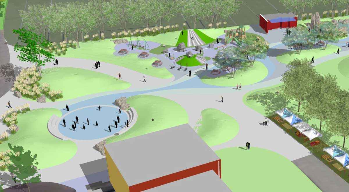 Artist renderings show the current vision for the property, with a "nature and adventure theme" expressed through natural rock elements, including some that will contain water features for the spray area, and slides in the play area built into an earth-formed hill. Learn more about the properties from Metro Parks.