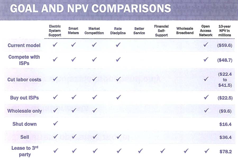 Over the years the City has worked with consultants to keep Click! viable, and various things have been tried, including a deal with ISPs currently set to expire in 2016 that locks in rates while the ISPs grow the customer base. More recent assessments show that's not working either, and look at a range of alternatives for moving ahead. Alternatives were evaluated in light of goals for the network (see the above chart). The options of selling or shutting down Click! were considered, but it was determined that the cons outweigh the pros, with the elimination of a publicly-owned network leading to a decrease in options for customers, and an eventual decrease in services.