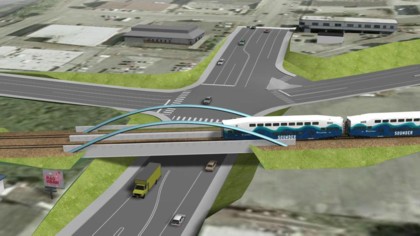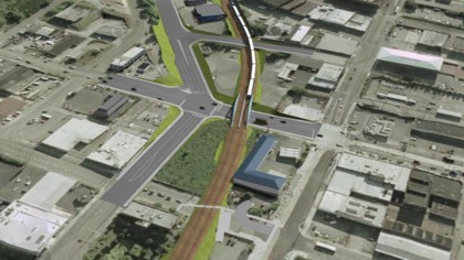 Sound Transit has provided a couple artist renderings of the rail crossing on Pacific Ave. The crossing as it is shown here, could accommodate two sets of tracks across Pacific, though the current plan only calls for one set. The additional line would be built depending on the needs of Burlington Northern.
