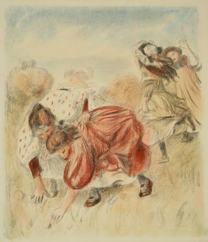 The freestanding wall in the middle of the space illustrates the more practical benefits of the painter’s venture into printmaking. All of the works hanging here were part of an album prepared by Renoir at the urging of his dealer, Ambroise Vollard, who had convinced the artist that he could reach a wider audience with prints than with paintings alone. Renoir was a sought-after artist, and print editions—multiple original objects made at one go—satisfied a market demand for his work.