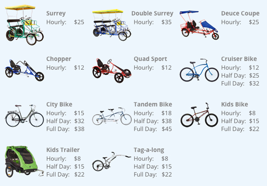 Rental options will include traditional bikes for all ages, alongside some more unique options like the Surrey, the Double Surrey, the Deuce Coupe, the Chopper and the Quad Sport. If you have a little one, but no trailer or 3rd wheel, no worries - you can rent one of those too (the trailers and 3rd wheels, not the little one, those are sold separately). The Surrey seats up to 4 adults and 2 small children, or go big with the Double Surrey, which seats up to 6 adults and 2 small children.
