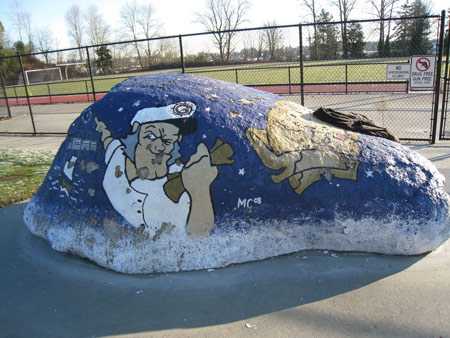 Ken, This story is so cool! Since our neighborhood is making a wish list for the safe & clean program maybe we should ask for those signs to be placed around the area. Let’s see, Manitou Park vs So.Tacoma Rocks? I call those very large rocks leaverites = to big to move so leave it right there! I know that the rock on 56th used to be the Lincoln High School Rock. The students would paint it with Lincoln colors and then a rival school would paint over it. Thanks for the history lesson. Kathy