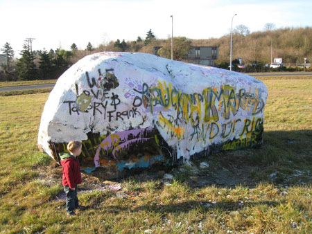 If you have gotten of the interstate at 56th street then undoubtedly you have noticed this magnet for the expression of teen love. This unofficial icon has been welcoming visitors to South Tacoma for who knows how long. One could probably determine the age of this rock by boring a hole and counting the paint rings. I’d love to discover the origin of this stone. Was it unearthed by Eisenhower’s interstate or did it precede the 50’s? Was it moved or did the civil engineers simply decided to build around it like Mike Mulligan’s steam shovel? If you have clues, let me know.