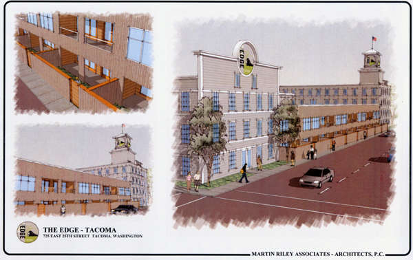 From the rendering, it’s not immediately clear if they’re showing the Puyallup Ave. side or the 25th St. side. I believe the earlier plans were to renovate the factory building and build a new structure on the parking lot. I’ll bet what we’re seeing is the 25th St. side. I doubt they would be able or willing to pull off a new building right now.
