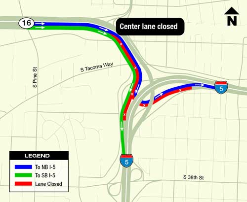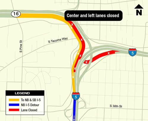 A total of three nights of closures and two days of daytime restrictions will be scheduled for eastbound SR 16. Crews will pave and stripe a segment of highway to move eastbound SR 16 traffic from the current temporary eastbound viaduct onto the new permanent eastbound viaduct.