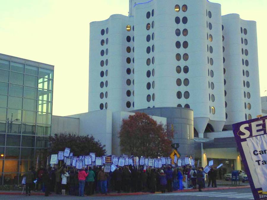 The strike follows recent community actions around charity care problems at CHI-Franciscan, including several protest actions held by Washington CAN! highlighting how stingy the hospitals, identified as nonprofit charities, are with financial aid and charity care.