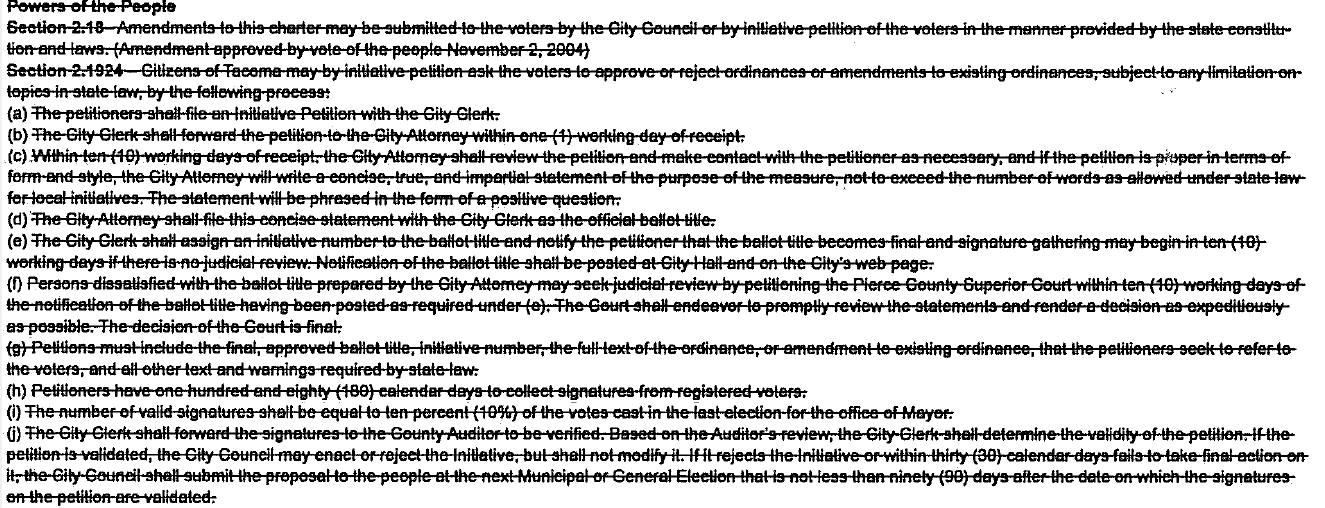 The copy of the charter used with the petition also struck out the entire "Powers of the People" section. At first we thought, this must be housecleaning. The rules enabling Tacoma's citizen to vote on amendments to the charter submitted by the City Council or via initiative must be somewhere else in law. Except, it isn't.