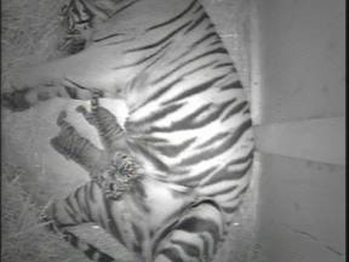 Staff have only seen the cubs on video survelliance from inside the tigers’ behind-the-scenes nest box, but they say Jaya and the two cubs appear healthy. A third cub was born with the litter, but died during birth.