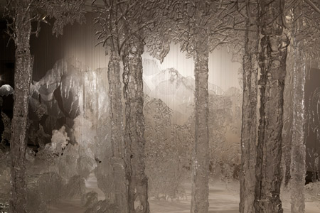 Situated across from Artifact, the fragile-looking Landscape is a meditation on permanence and impermanence. Constructed of colorless glass and suspended by wires, Landscape creates a layered forest scene with mountains, a waterfall, and a mirrored stream (don’t forget to look up to see the light reflected on the ceiling) running down the middle. The overall effect is a frozen landscape that looks as if it is doomed to melt or shatter.