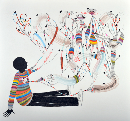 A recent article reviewing the show was titled “Sad, Beautiful Drawings”. I would argue that the show need not be categorized this way. This show is perhaps a method of coping with the “seasonal affective” that many of us experience in the Northwest, rather than a direct expression of it. There is much joy, energy, excitement to be found in Sean’s work—practically euphoric at times, if you let it be. Where it may be interpreted as sad, it also retains a humble sense of humor which, combined with the rhythmic pen strokes and mesmerizing patterns, offers relief and a way out.