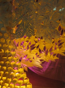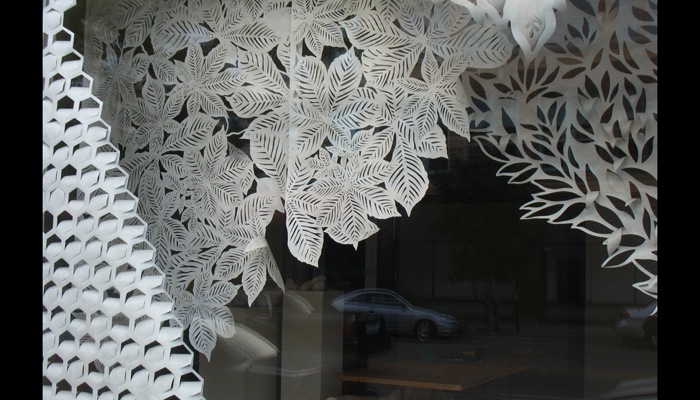 Cooning’s The Golden Hour presents us with large, detailed and delicate white paper cutouts that, within their organic, sweeping forms, create a sense of refuge from the aggressive urban setting. The lacy layering contrasts with the surrounding rough pavement and brick, creating a tangible fragility.