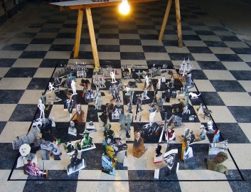 The paper figures, placed almost chess-like on the storefront’s existing black and white linoleum, extend past the light of a single bulb into the darkness of the space’s dirt and concrete, creating an ominous and reflective effect. There seems to be strategy in the crowd’s ranks, but where they have come from and where they are headed are both unknowable. The darkness of the space adds intrigue to the rows of planets strung above, emphasizing the spatial and celestial relationship of humanity’s cultural development. Hibbard’s installation raises questions about community and shared experience, creating an awareness of the city as an environmental and societal element.