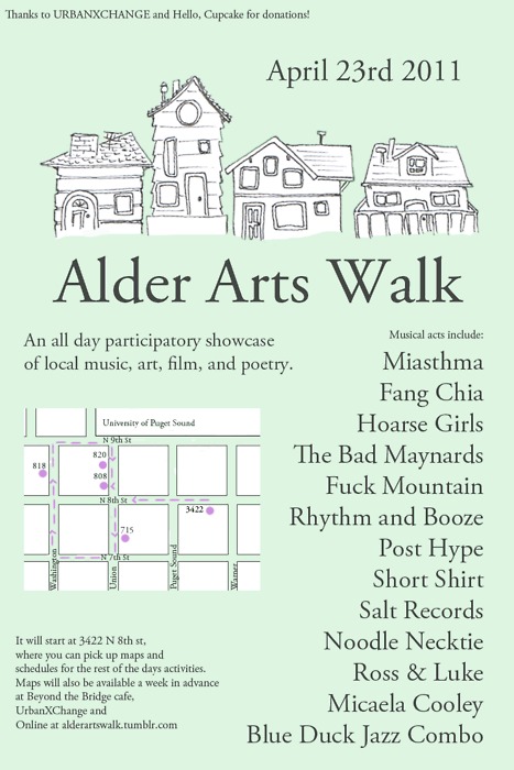 The fourth annual Alder Arts Walk from the University of Puget Sound. Students present bands, art, film and poetry, using their homes along Alder Street as free venues all day long. Alder Street, across from the University of Puget Sound campus. More information here.