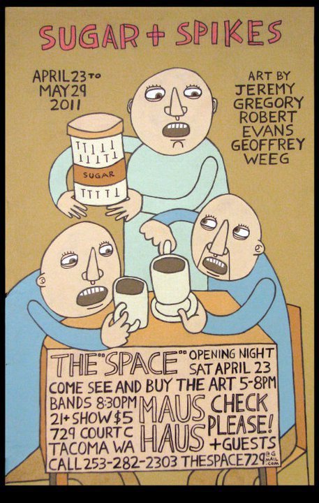 Sugar & Spikes, the new art exhibit at The Space opens featuring work by local favorites Jeremy Gregory, Geoffrey Weeg and Robert Evans. Gallery opens at 5 pm, stay for music at 8:30: Check Please! and Maus Haus for $5. “The Space facebook page here.