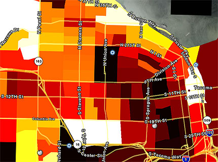We’re always a sucker for good map data. The folks at Juice Analytics have merged census data with Google Earth to provide us with population density, median age, and male/female ratio in each state at two levels of detail. The image above shows median age data for Tacoma: