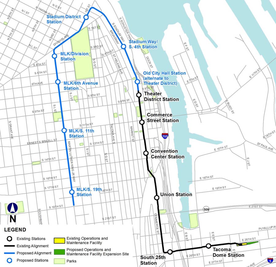Last year the city council made the official decision to recommend moving forward with plans for an expansion of Tacoma's Link light rail. The route chosen would take the light rail up the hill from its current northern terminus near 9th and Commerce to the Stadium District, then up Division to MLK, and across through the Hilltop to a new terminus near South 19th and MLK. That alignment, with seven recommended stations, went through an environmental review, the results of which are available for public comment, and review by Tacoma's Planning and Transportation commissions.