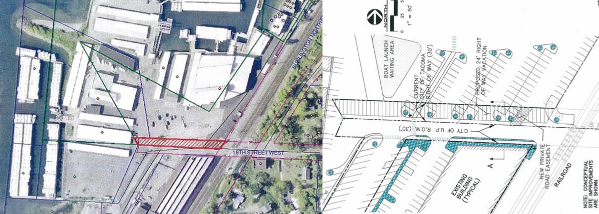 One of the more interesting requests for vacation on the agenda this week comes from the owners of Narrows Marina, who are requesting the vacation of the north 24 feet of the 19th Street West right-of-way, west of the Burlington Northern Santa Fe Railroad right-of-way and the terminus of City of Tacoma right-of-way "for future improvements to pedestrian access ways and boat launch parking."