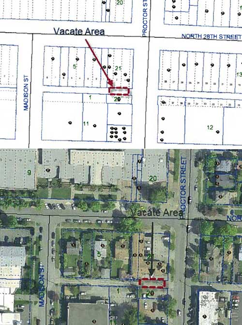 The vacation is being requested as a part of a plan to develop a five-story mixed-use development on the block between 27th and 28th and Proctor. The development would include retail and residential components. The request to vacate air rights would allow the development to span the right-of-way and keep the alley open to the public for vehicular traffic.