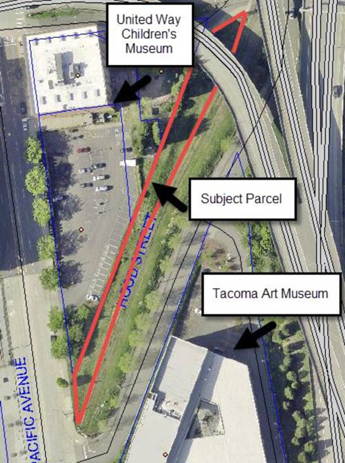 The City has been working with BNSF for several years now to assemble the property for the Prairie Line Trail. Last year the City acquired a portion of the property it wanted for the linear park running from the Brewery District, through the UW Tacoma campus, to the Foss waterfront esplanade. The property acquired then was a narrower strip at some points, specifically the stretch that lies between the United Way/Children's Museum building and the Tacoma Art Museum.