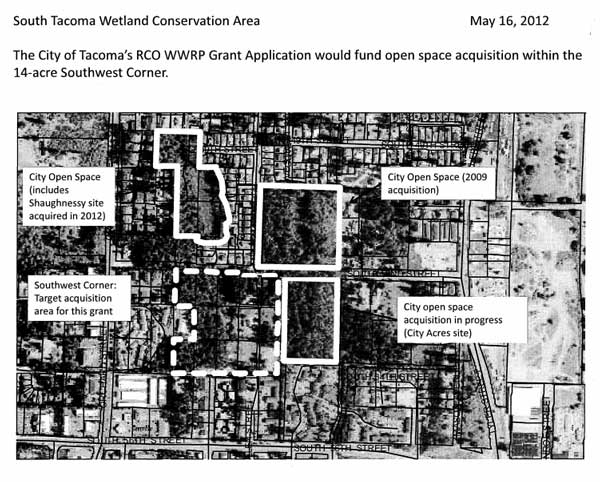A resolution on this week’s City Council meeting agenda would authorize the submittal of a grant application to the Washington Recreation and Conservation Office, in the amount of $500,000, to acquire open space property within the South Tacoma Wetlands Conservation Area, located in the vicinity of South 52nd and Mullen Streets, for conservation purposes. The Tacoma Daily Index has a good run-down of the grant application, including a note that previous City and County expenditures would be allowed to count to meet the required local match, and the City would not need to put further funds towards the proposed acquisition.