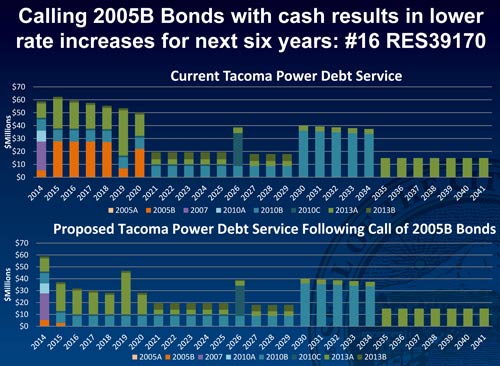 This first resolution approves the calling of $122 million in existing TPU 2005B bonds, using a combination of cash on hand and excess bond reserve funds. This will result in a 41% reduction in debt service for the utility over the next six years. The graph provided by Tacoma Power illustrates the savings – the orange 2005B bonds disappear from the chart in this proposed plan, significantly reducing the total dollar amount of bonds serviced through 2020.