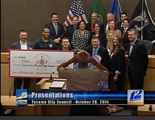 Tacoma firefighters presented the Muscular Dystrophy Association with a check for $47,862.05 they raised from the Tacoma community for MDA this year in their annual TFD Fill the Boot campaign. You may have come across them collecting donations at 38th and Steele Street by the mall.
