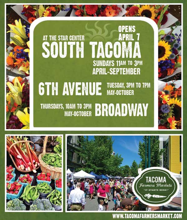 The air temperature is finally rising, bits of blue sky showing, and daffodils joining the crocuses, there’s no question that spring is in the air. Another sure sign of spring is the return of Tacoma’s Farmers’ Markets. The Proctor Market returns to its weekly schedule beginning this Saturday, and the South Tacoma Market won’t be far behind. Ahh, spring.