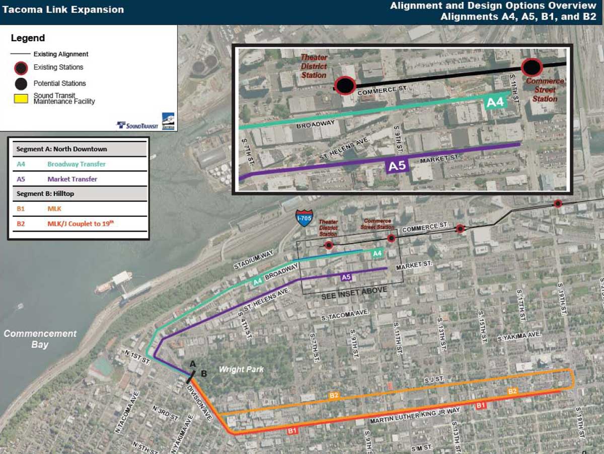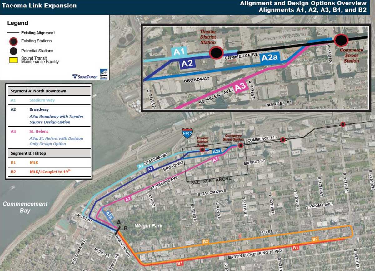The full corridor has been divided into two segments for the purposes of this phase of evaluations: Segment A connecting the existing Link to the Stadium District, and Segment B connecting Stadium to the MLK Mixed-Use Center. Staff have identified five possible alignments in Segment A, and two in Segment B.