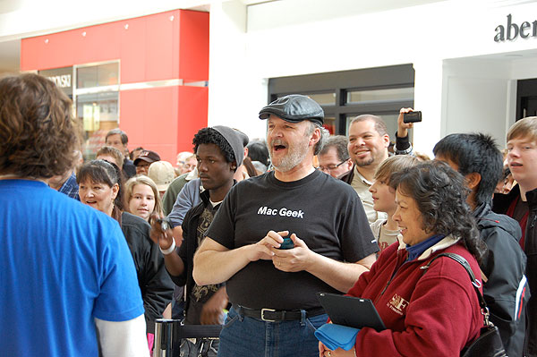 His was the lone group waiting outside the mall when the doors opened at 5 a.m., but five hours later he was posing for pictures with employees of the new store. Five minutes after that, he was able to add the third t-shirt to his growing collection of Apple grand opening commemorative t-shirts. (Hurry down if you’re in the area — best estimates indicate only about half of the t-shirts have been handed out).