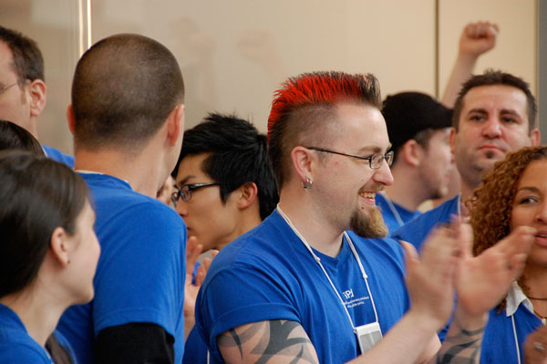 Enthusiastic employees break-danced and led the waiting crowd of Apple freaks in a “T-Town” chant as the clock ticked down to the official opening.