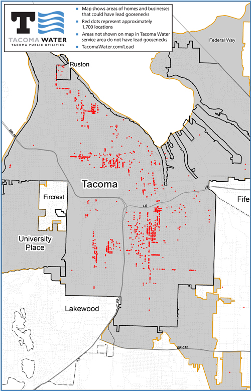 - To protect privacy, the map doesn't show specific addresses or street names, but customers who thing their homes might be among the red dots can submit their contact information, and Tacoma Water staff will check their records for your location and respond.