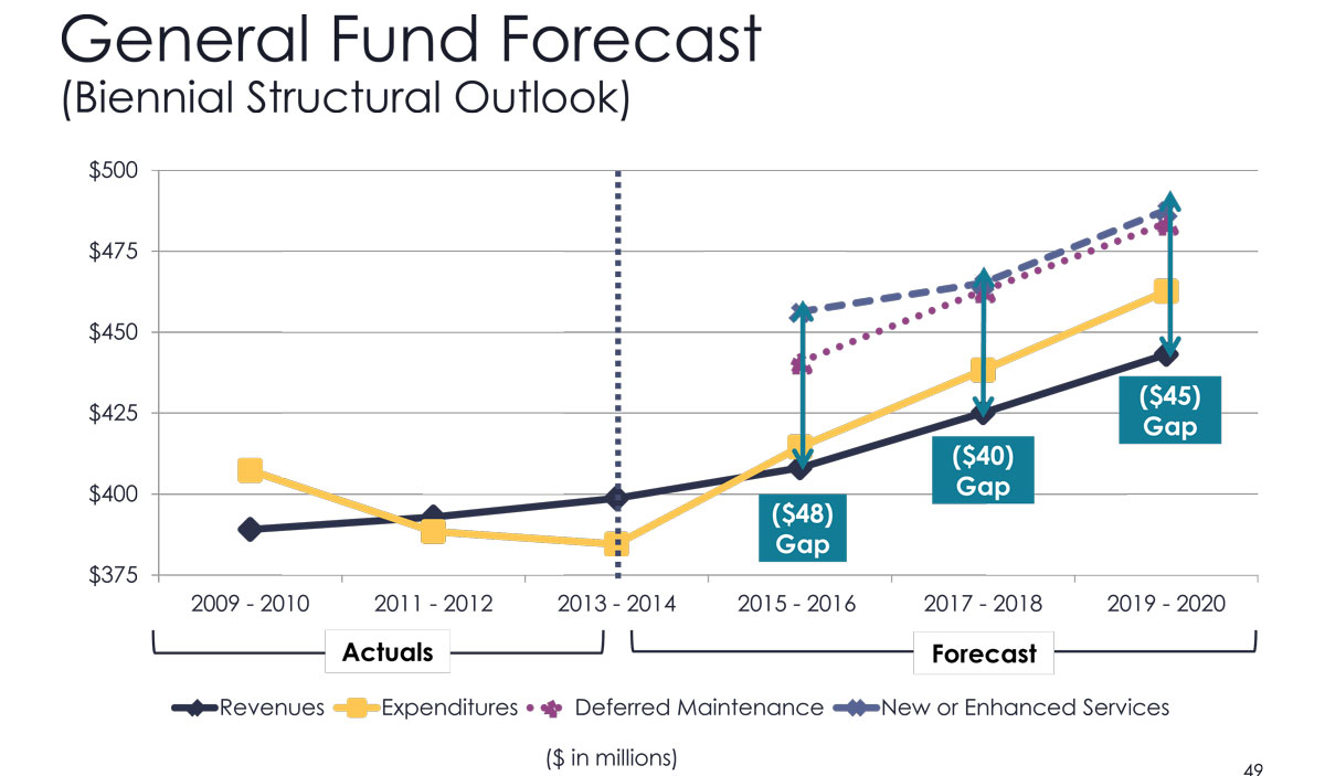 Revenues are predicted to increase at a slightly higher rate over the next half of the current decade than they have over the first half, outpacing spending if current levels of spending on services are maintained... but in order to achieve lower costs in the past few years, the City deferred maintenance and replacement of some City assets. The deferred maintenance includes things like replacement of vehicles in the City's fleet, maintenance of streets and City-owned facilities, and IT maintenance and upgrades.