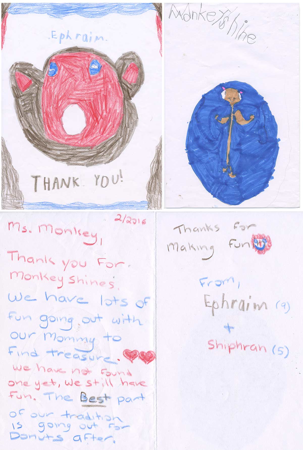 We also hear saying thank you might bring good fortune and inspire the monkeys. Do you have a story to tell? Do you want to draw a picture?