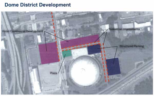 The second scenario, for renovating the Dome as a “civic arena” is considered to be the “more realistic” of the two. This scenario would involve improvements to back of house and support spaces; signage; parking; lobbies; seating; exhibit hall renovation; and public area improvements including concourses, HVAC, and a club/restaurant space. The overall cost for these improvements is estimated at $184 million.