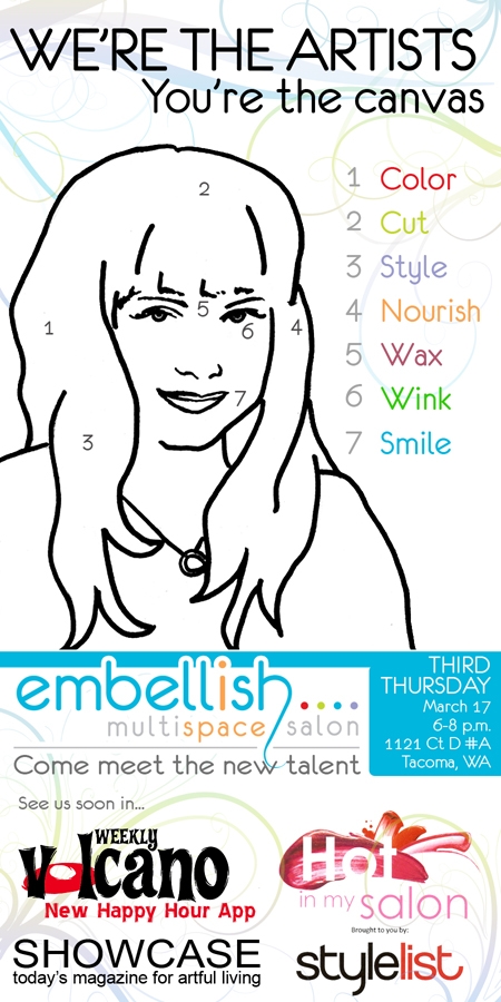 Third Thursday Art Walk, the monthly event that opens Tacoma’s museums and galleries to the public at no cost, is primarily a showcase for static exhibits. But Embellish Multispace Salon (1121 Ct. D, #A) aims to enhance Art Walk’s volume this Thursday with art that lives – the art of you.