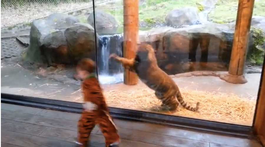 The plot is pretty simple: kid visits zoo on Halloween, dressed as tiger. Meets real tiger. Cuteness ensues. Mom catches it on tape. Did we mention the cuteness?