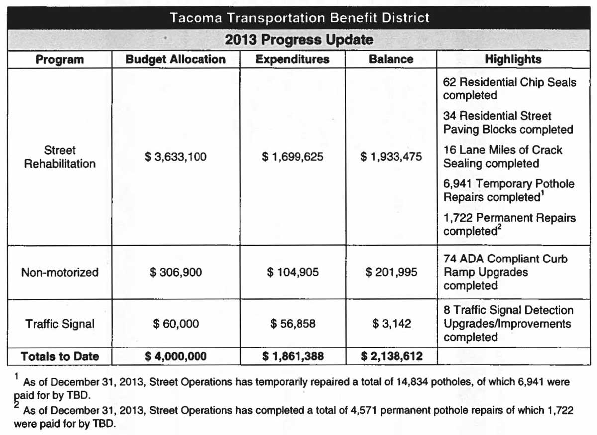 In 2013, $4 million was collected by the TBD. As of the end of 2013, less than half of that had been spent, mostly on "street rehabilitation," with smaller amounts going toward non-motorized transportation improvements and traffic signal upgrades and repairs.