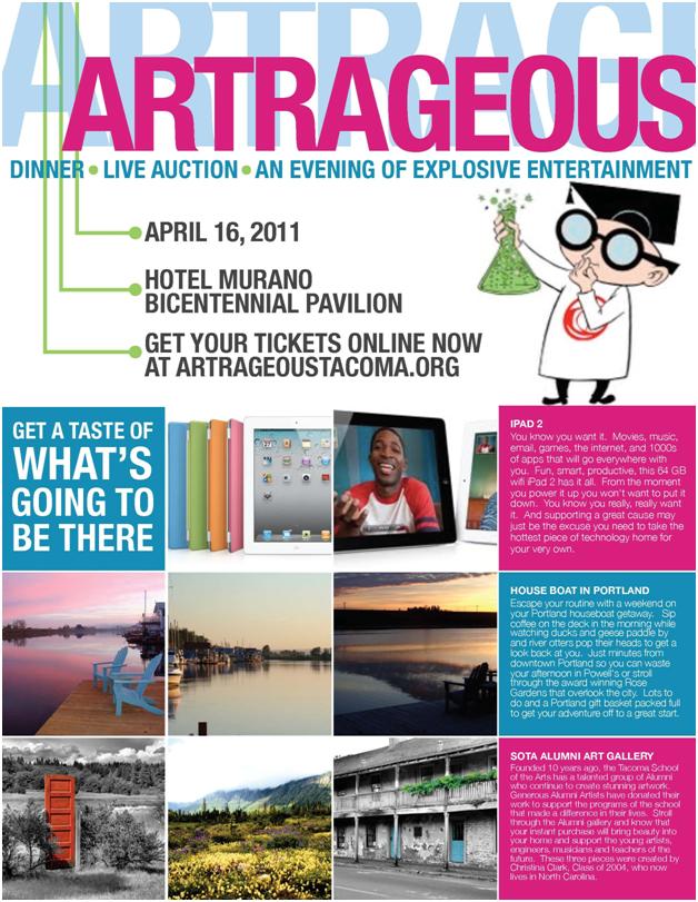 Tacoma School of the Arts (SOTA) will hold its annual fundraiser, Artrageous, at the Murano Hotel Bicentennial Pavilion April 16th. SOTA and SA MI (Tacoma Science and Math Institute) both benefit from this event. Please consider a donation and/or attendance for this great event. Always great entertainment and assistance by the students themselves. Tickets are $75.00 each.