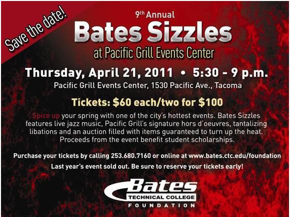 Next will be Sizzles, the Bates Technical College annual fundraiser, which takes place at the Pacific Grill Event Center April 21st. The money raised at this event is used to give scholarships to students and aid instructors by purchasing much-needed material and equipment that cannot be budgeted – especially these days – from administration. Please consider a donation and/or attendance for this great event. The Pacific Grill provides appetizers (delicious!) and Sizzles attracts many of the most interesting people in our community.