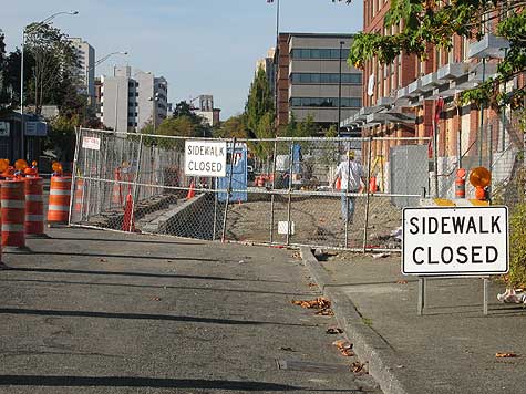 As I was driving the streets of Tacoma today, I noticed something that made me think. It happens sometimes and, this time, I felt like sharing. Market street has cones, barrels, and signs routing traffic from left to right and back again between South 19th and South 21st street. The construction on the street is related to the new UWT student dormitory. What I noticed is that the sidewalk extends out into the street where parking used to be. Given the distance, it could be the equivelant of twenty spaces of street parking that would be useful for places like The Rock, UWT, Buzzard CDs, The Swiss, and others.
