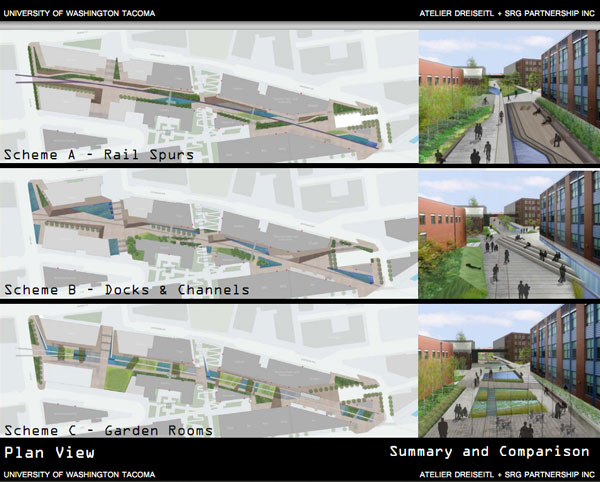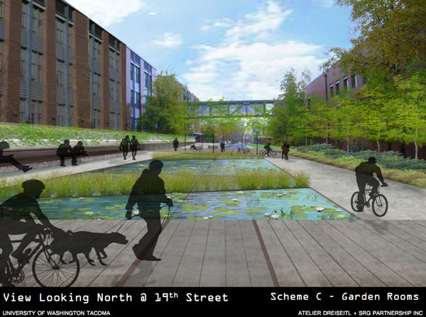 Guided by student and community input, landscape architects Atelier Dreiseitl have developed a preliminary plan that transforms the 80 foot wide rail corridor through the UW Tacoma campus into a vibrant new open space. The plan celebrates and leverages opportunities provided by community connections while honoring the industrial past of the surrounding area and incorporating sustainable strategies for storm water management.
