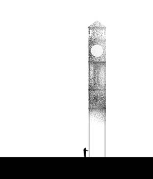 This design combines art and function by creating a tower-like structure that evokes the traditional form of ‘clock tower’, using materials of varying transparency to create a “there but not there” feeling. The support footing for this concept would be square or rectangular at ground level. It also would have two clock faces.